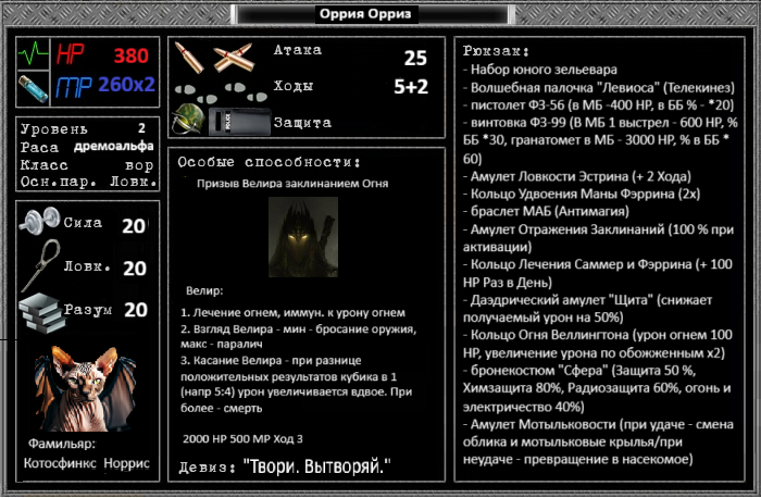 Девиз: "Магия создала Мир, чтобы Мир забыл Магию..." Класс: маг Раса: Принцесса Даэдра/дремора-маг, 171 г. Ф. Э. Особые способности: Имм. к Вампиризму Инвентарь: - желтая пустышка - Амулет Альмаэдры (Иммунитет к Болезням 100 %) - Амулет Очарования Сарфейна (1 раз в день) - пистолет ФЗ-56 Сарфейна (в МБ -400 НР, в ББ % - *20) 20х - Великий камень душ аврорианца (Душа неясна) - Амулет Сарфейна-Аззарха (+ 100 НР и МР) - Кольцо Защ. от Эл-ва Альмаэдры (100 %) - Кольцо Пера Милаэдры (Раз в День) - Амулет Таэдры (Защ. от Хол. 50 %) - Огненный Меч Фаэдры (-20 НР Огнем) - Кольцо Погибель Гвалхвина - Зеркало "Ламент" Фейнаэдры для связи с душами дремор Сила: 2498, Ловкость: 2498, Разум: 2498, Жизнь: 47462, Мана: 32474, Ход: 624, Атака: 2503.