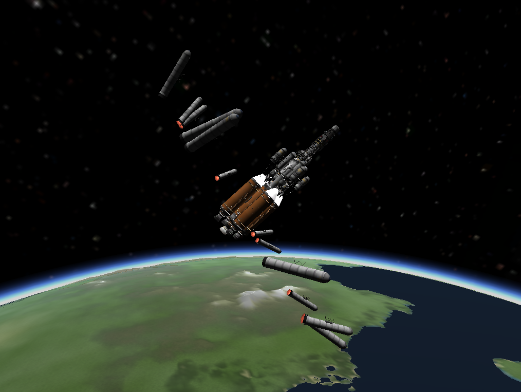 Вторая ступень была сброшена, как боковые, так и основная мощная ракета, во время остаточной работы которой Нелдоран развернул ракету на 45 градусов. После сброса основной ракеты второй ступени автоматически включилась новая партия твердотопливных ускорителей. - Высота 75 километров.
